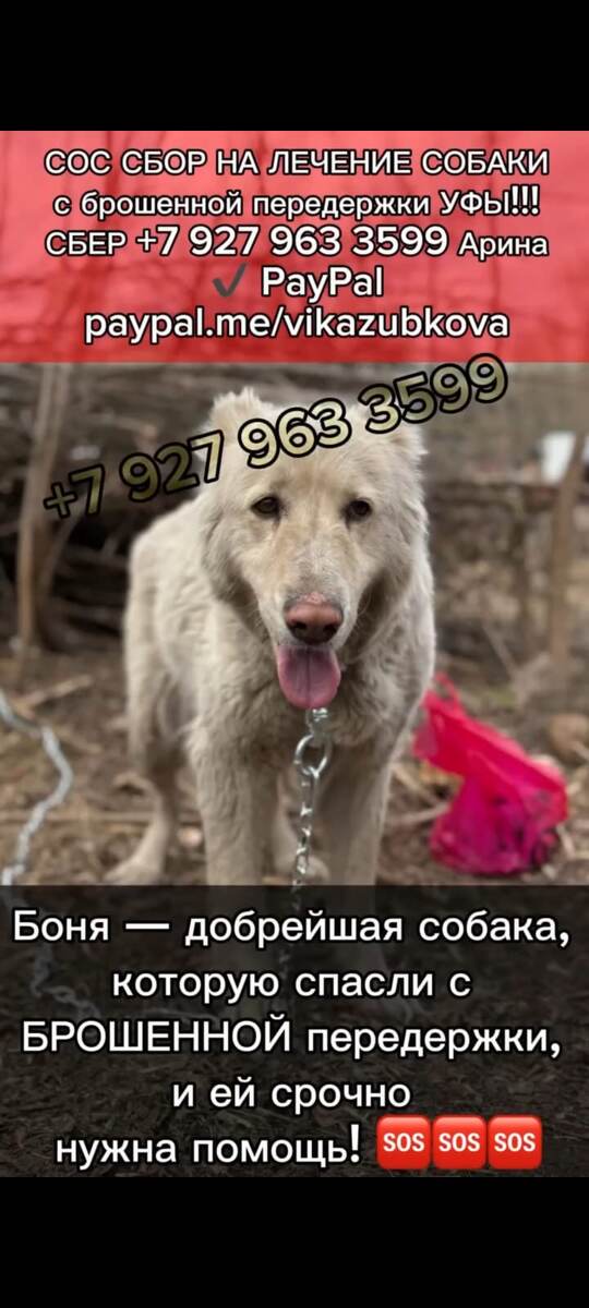 У Бони рак... Только выживи, девочка!НУЖНА СРОЧНАЯ ПОМОЩЬ, люди🙏🏼😭 СОС СБОР, для БОНИ! Боню предали .., предали уже ДВАЖДЫ!! Сначала её выгнали из дома "хозяева", а потом - бросил на передержке недобросовестный куратор.... Но это оказалось только начало испытаний для невинной Доброй Девчонки.... Ведь У БОНИ ОБНАРУЖИЛИ РАК! ‼️ Россия, ПОМОГИТЕ, ЛЮДИ! Боня находится в Уфе. У Бони рак молочных желез, и сейчас ей требуется удаление опухоли и ряда молочных пакетов, мы не можем оставить ее в беде — лечение стоит 32.000₽. 😩😩😩 Также у Бони атрофия мышц задних конечностей, ей необходимы долгие и частые прогулки. Мы ищем ей также ФИЗИЧЕСКОГО КУРАТОРА или СЕМЬЮ, так как это невозможно организовать в условиях «приюта» 😩😩😩 Друзья, давайте поддержим ее!🙏🏼 ‼️Бонечке нужно срочно пройти: Унилатеральную мастектомию - 32.000 руб ⚡ НУЖНО СОБРАТЬ 32.000 РУБ ⚡ ЭТО ЦЕНА ЕЕ ЗДОРОВЬЯ... ЕЕ Жизни... UPD на 28 июля: собрано ... ⚡⚡⚡ К СБОРУ 19.260 руб. ⚡⚡⚡ Для СПАСЕНИЯ ЖИЗНИ, пожалуй