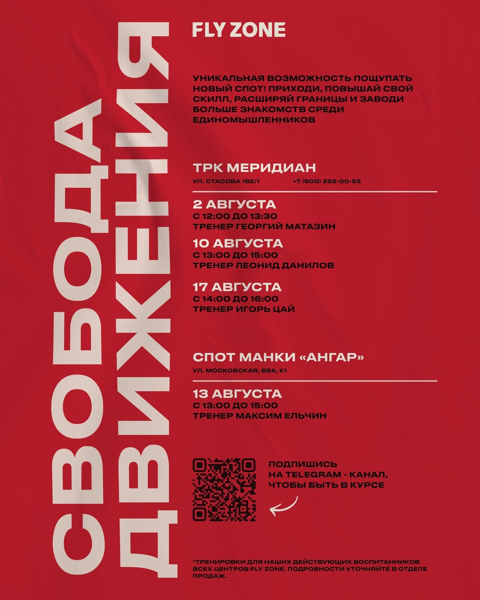 Открытые тренировки по паркуру в августе в зале ТРК “Меридиан” и на споте “Ангар” В августе в зале ТРК “Меридиан” и на споте Манки “Ангар” пройдут открытые тренировки по паркуру. Это отличная возможность для трейсеров улучшить свои навыки, познакомиться с единомышленниками и провести время с пользой. Что взять с собой: хорошее настроение, готовность к активному движению и общению, а также стремление развиваться. Условия участия: мероприятие бесплатное, но обязательна предварительная запись у тренера. Посещение доступно только для действующих воспитанников школы паркура FLY ZONE. Тренировки проходят в специально оборудованных местах, где можно безопасно отрабатывать элементы паркура под руководством опытных наставников. Это не только физическое развитие, но и обмен опытом в комьюнити трейсеров. За дополнительной информацией обращайтесь к администратору по телефону: +7 (900) 252 00 55. FLY ZONE | Спортивный центр | Краснодар #паркур #краснодар Подробнее...