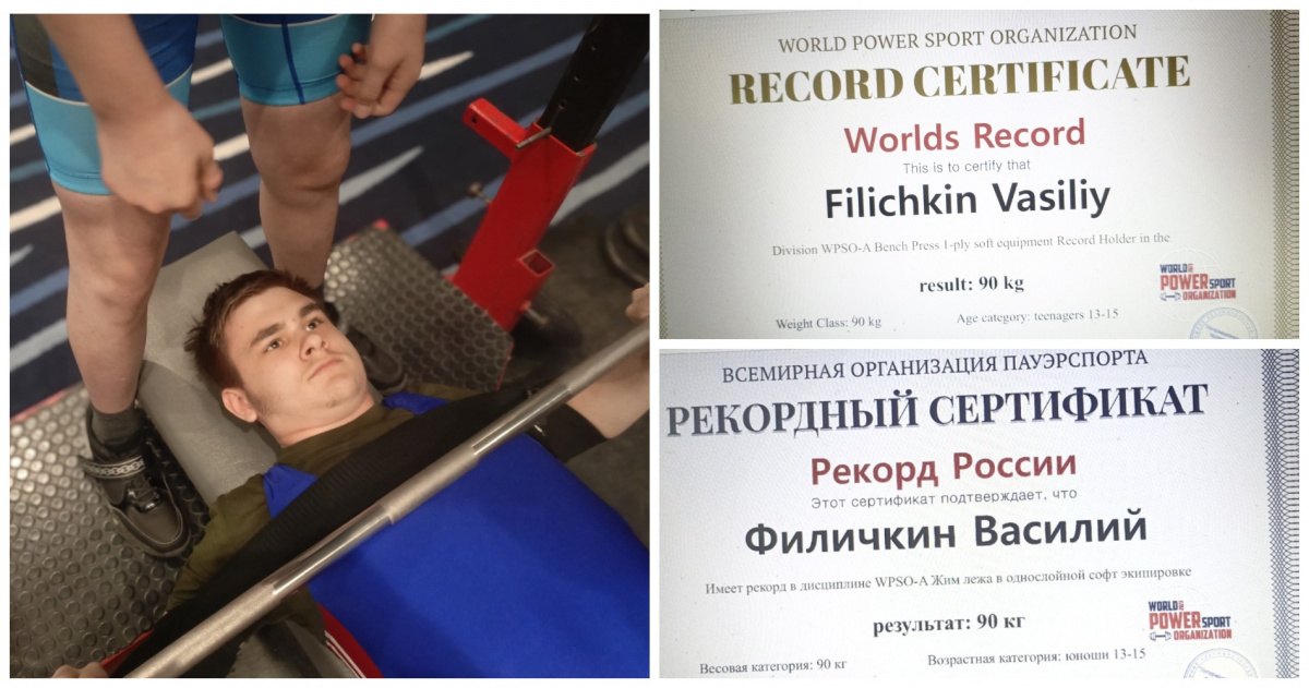 Об успехах 13-летнего внука рассказал известный челябинский журналист Владимир Васильевич Филичкин. У себя на странице в соцсетях он выложил фотографии двух сертификатов от World Power Sport Organization, Всемирной организации пауэрспорта, подтверждающих установление рекорда России по жиму лежа в однослойной софт экипировке в возрастной категории от 13 до 15 лет, а также – мировой рекорд по этой же дисциплине в той же возрастной категории. Челябинский школьник поднял вес аж в 90 килограммов. Рекордсмен занимается в челябинском клубе «Атлет». Владимир Филичкин в разговоре с корреспондентом «ЧелябинскСегодня» очень хвалил тренера внука, Дмитрия Абрамова. Но журналист и сам активно занимается спортом, поэтому помогал юноше в тренировках. И именно он во время Кубка Азии посоветовал Василию заказать на последний подход такой впечатляющий вес. «Этот не тот случай, когда я пытался, чтобы он достиг чего-то невозможного. Он трижды выступал на соревнованиях, и трижды я его готовил, и я заметил,