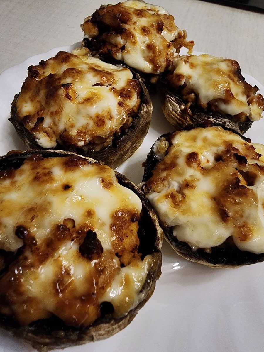 Фаршированные шампиньоны. 👉 Шампиньоны чистим, убираем ножки. Для начинки обжариваем куриный фарш с луком и специями. На грибы кладем начинку, сверху немного смазываем майонезом ( можно посыпать сыром). Готовим в аэрогриле при 180° 10-15 минут. #рецептываэрогриле #аэрогриль #ужин #напраздничныйстол