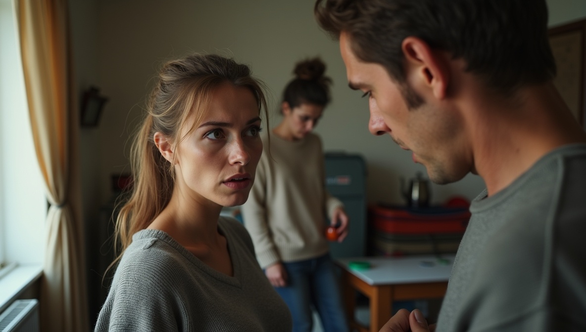 За столом сидел муж — ссутулившийся, с виноватым видом, крутящий в руках чашку. Напротив него — женщина лет сорока, худая, с усталым лицом и тёмными волосами, собранными в небрежный пучок.