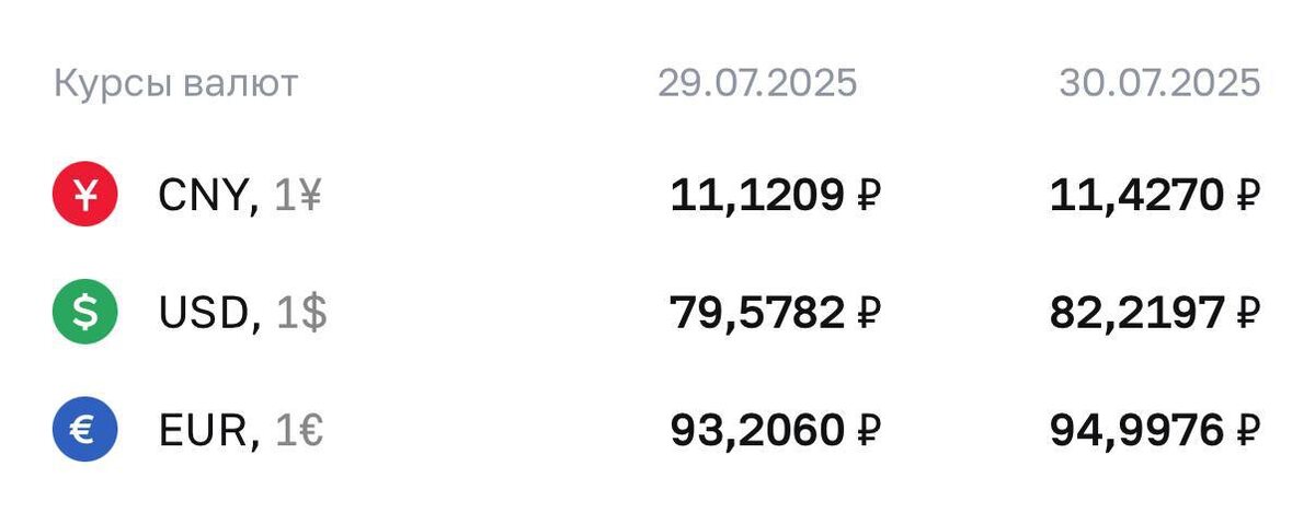 ЦБ повысил официальный курс доллара, установив его выше 82 рублей В последний раз валюта США стоила дороже ₽82 три месяца назад — 29 апреля. Официальные курсы валют на среду, 30 июля: 🔺доллар — ₽82,2197 (+₽2,64); 🔺евро — ₽94,9976 (+₽1,79); 🔺юань — ₽11,427 (+30,61 коп.). #НовостиРоссии