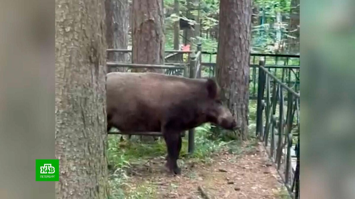 [ Смотреть видео на сайте НТВ ] Фотоловушка биолога Павла Глазкова засекла кабана внушительных размеров на кладбище во Всеволожске. По словам очевидцев, зверь собирал оставленные пирожки и конфеты. Специалисты отмечают, что подобные выходы диких животных на территорию населенных пунктов и садоводств — совсем не редкость. Некоторые из них находятся в непосредственной близости от лесных массивов, что является для животных естественной средой обитания. [ Смотреть видео на сайте НТВ ]
