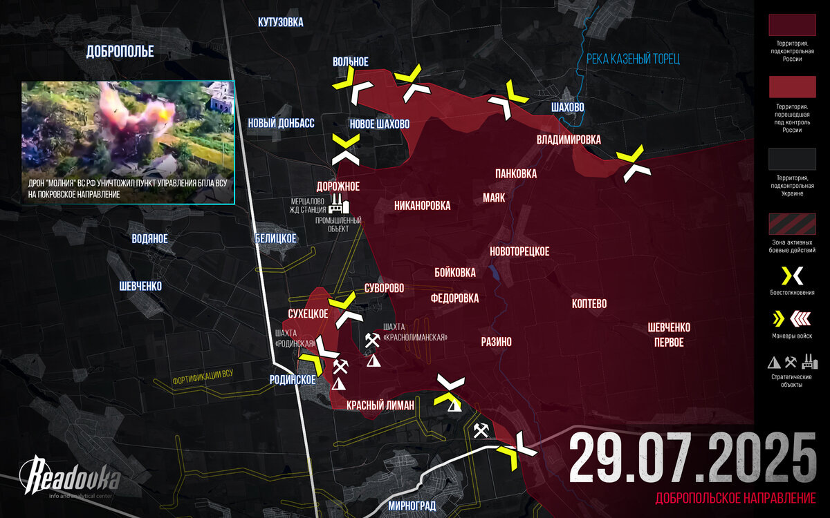 Начавшееся во второй половине июня наступление ВС РФ на стыке Покровского и Константиновского направлений к текущему моменту привело к действительно ошеломляющим результатам. Его смело можно считать фундаментом, обеспечившим непосредственные предпосылки для штурма Покровска, Мирнограда и Родинского с окрестными селами, составляющими большой оборонительный район. Но на этом список призов для русской армии не закончился. С дальнейшим развитием наступления вглубь обороны ВСУ наши войска сумели относительно быстро овладеть рядом населенных пунктов, среди которых недавно освобожденные Суворово, Никаноровка, Дорожное. В данный момент идут бои за села Новое Шахово и Вольное, также идут приготовления к штурму Ивановки и Нового Донбасса. А от Вольного до города Доброполье всего порядка 10 км. Это означает, что новое самостоятельное оперативное направление открыто.