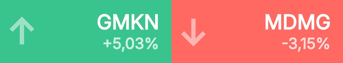 🔺 Топ-10 лидеров роста среди крупнейших акций: Норильский • 123 ₽ • 5,03% Сегежа • 1,51 ₽ • 4,72% Эн+ • 439 ₽ • 4,53% ФосАгро • 6 611 ₽ • 3,91% Мосэнерго • 2,09 ₽ • 3,36% Русал • 31,98 ₽ • 3,31% Полюс • 1 994 ₽ • 3,27% Лента • 1 523 ₽ • 3,18% Мечел прив • 79,90 ₽ • 3,03% Роснефть • 428 ₽ • 3,00% 🔻 Топ-10 лидеров падения среди крупнейших акций: Медикал Гр • 1 110 ₽ • -3,15% ВИ.ру • 78,20 ₽ • -2,49% Татнефть п • 614 ₽ • -1,22% ЮМГ • 733 ₽ • -0,92% НЛМК • 110 ₽ • -0,88% Татнефть • 645 ₽ • -0,85% Транснефть • 1 293 ₽ • -0,60% Группа Поз • 1 393 ₽ • -0,59% М.Видео • 88,05 ₽ • -0,34% Московский • 7,17 ₽ • -0,32%