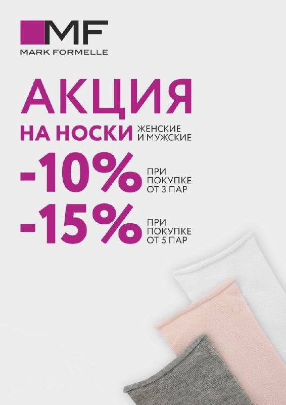 Mark Formelle знает: носков много не бывает! С 28 июля по 10 августа в Mark Formelle действует специальное предложение на все женские и мужские ЧНИ: при покупке трех или четырех пар носков мы подарим скидку 10%, а при покупке от пяти пар – скидку 15%! • носки унисекс белые с надписью в виде формулы e=mc2 • носки унисекс серые с надписью "у тебя что-то упало" • носки унисекс желтые с надписью "форевер янг" • носки унисекс серые с надписью "не верь. не бойся. не проси" • носки унисекс серые с узором в виде орнамента
