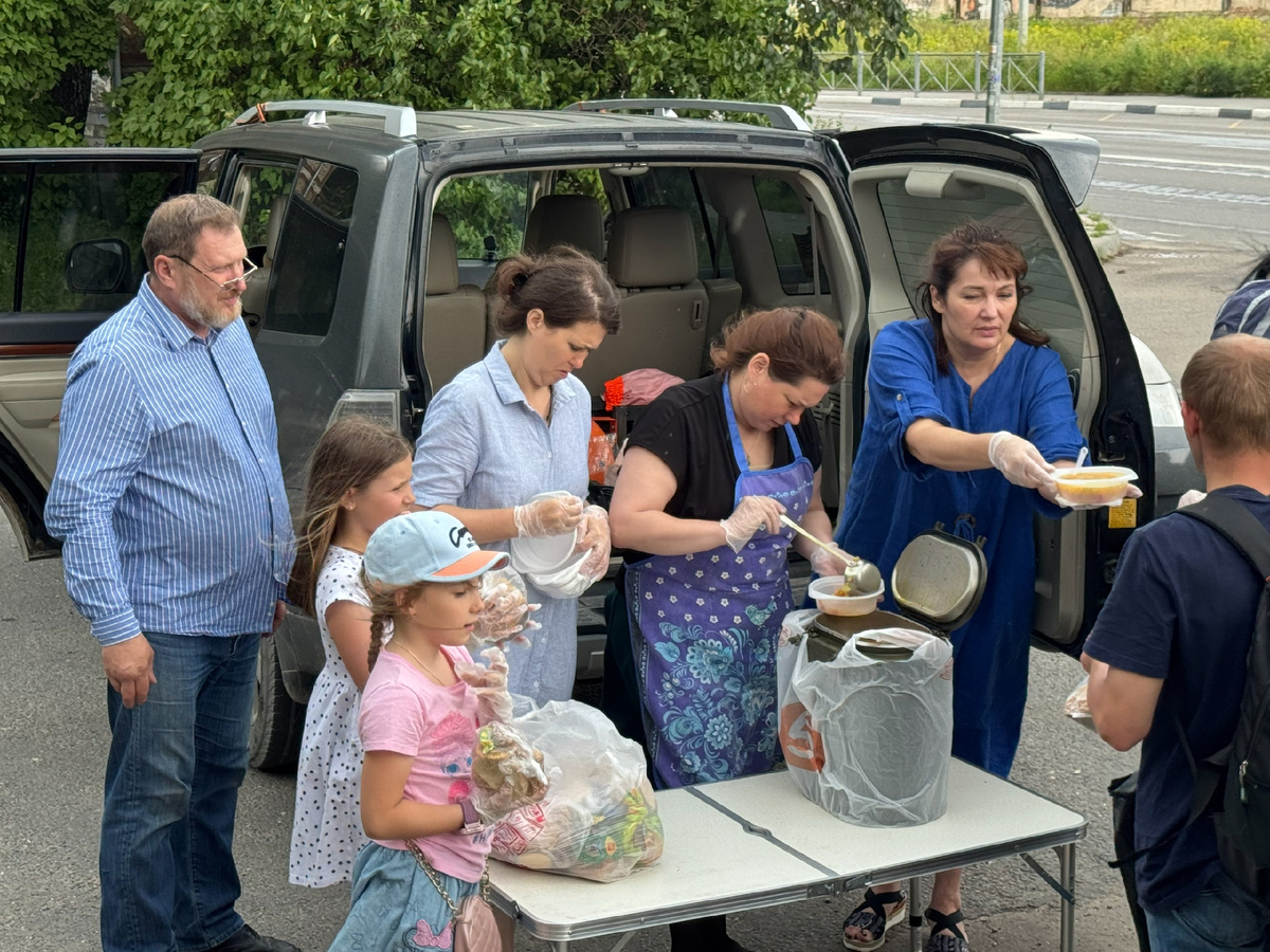 25 июля 2025 года прихожане Псковского храма Воскресения Христова (в Орлецах) во главе с настоятелем протоиереем Валерием Андрониным раздали людям, оказавшимся в трудной жизненной ситуации, бесплатное горячее питание. На обед были: суп и гречка, хлеб и батон, печенье и пряники, конфеты и фрукты, а также компот. В этот раз прихожане накормили 30 человек, находившихся на улице, и 5 человек, проживающих в городской социальной гостинице.