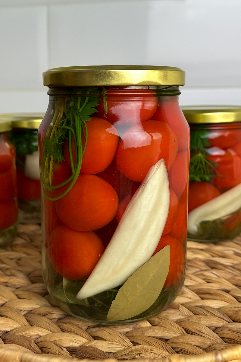 Лето — это не только пора сочных овощей, но и лучшее время, чтобы подумать о зимних запасах. Когда за окном холод и вьюга, так приятно открыть баночку ароматных, сладковато-пряных маринованных помидоров… Особенно тех, у которых рассол пьют быстрее, чем съедаются помидоры! Сегодня делюсь именно таким рецептом — проверенным, сбалансированным, с лёгкой сладостью и душистыми нотками листьев и специй. Эти помидоры любят все — и дети, и взрослые. Они отлично хранятся, а готовятся без особых усилий. Главное — соблюдать порядок, чистоту и довериться рецепту. Для маринада (не варю его, а засыпаю в банку и заливаю кипятком): 1. Подготовка — ключ к успеху. Перед началом убедитесь, что ваши банки и крышки тщательно вымыты и простерилизованы. Это важно для длительного хранения. Также промойте все овощи и зелень. Листья желательно ошпарить кипятком. 2. Выкладываем ароматную «подушку». На дно стерильной банки укладываем чеснок, перец (душистый и чёрный), листочки (вишни, хрена, смородины, ореха, есл