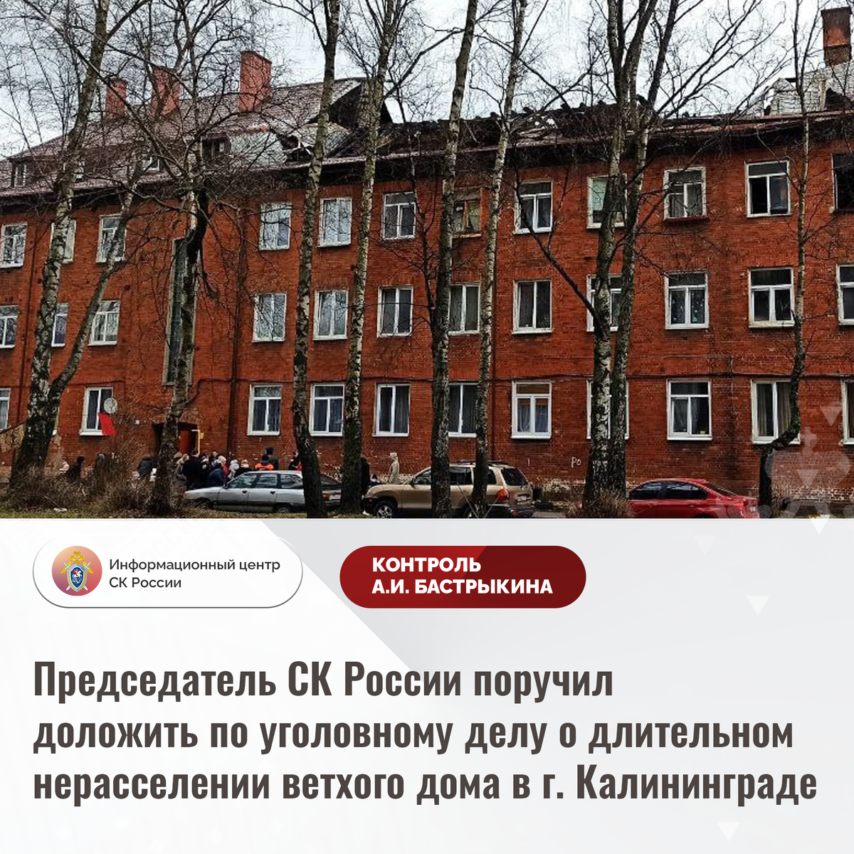 Председатель СК России поручил доложить по уголовному делу о длительном нерасселении ветхого дома в г. Калининграде В Информационный центр СК России поступило обращение по вопросу продолжающегося нарушения прав жильцов многоквартирного дома по улице Артиллерийской города Калининграда. В марте 2023 года в здании, 1906 года постройки, произошел пожар, в результате которого кровля оказалась разрушена, в перекрытиях образовались трещины, а системы водо- и газоснабжения пришли в негодность. Несмотря на выполненные ремонтные работы, угроза обрушения строения не устранена. Многочисленные обращения в компетентные органы результатов не принесли. Ранее указанная ситуация освещалась в СМИ. А.И. Бастрыкин ставил ее на контроль в центральном аппарате ведомства. В СУ СК России по Калининградской области расследуется уголовное дело. Председатель Следственного комитета Российской Федерации Александр Иванович Бастрыкин затребовал у и.о. руководителя СУ СК России по Калининградской области Дмитрия Геор