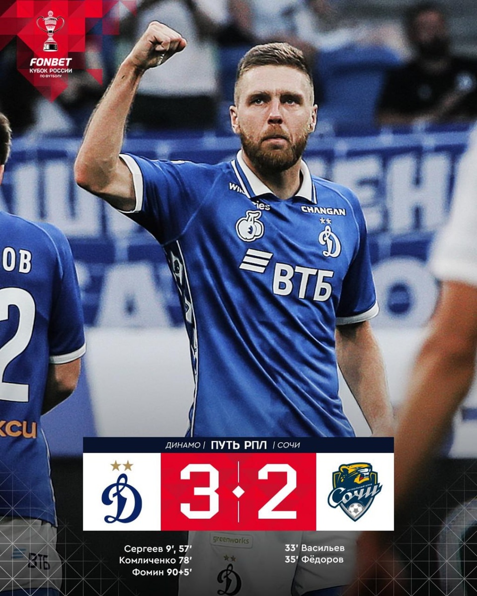 ⚽️⚽️ «Динамо» вырвало победу у «Сочи» в самой концовке! Матч первого тура Пути РПЛ Кубка России по футболу завершился со счётом 3:2. В составе бело-голубых дублем отметился Иван Сергеев, а победный мяч на 95-й (!) минуте забил Даниил Фомин. У южан результативные удары нанесли Дмитрий Васильев и Захар Фёдоров. Таким образом, после стартового матча группы B динамовцы расположились на первой строчке с тремя очками, в то время как сочинцы замыкают квартет без набранных баллов. @russian_rt_sport