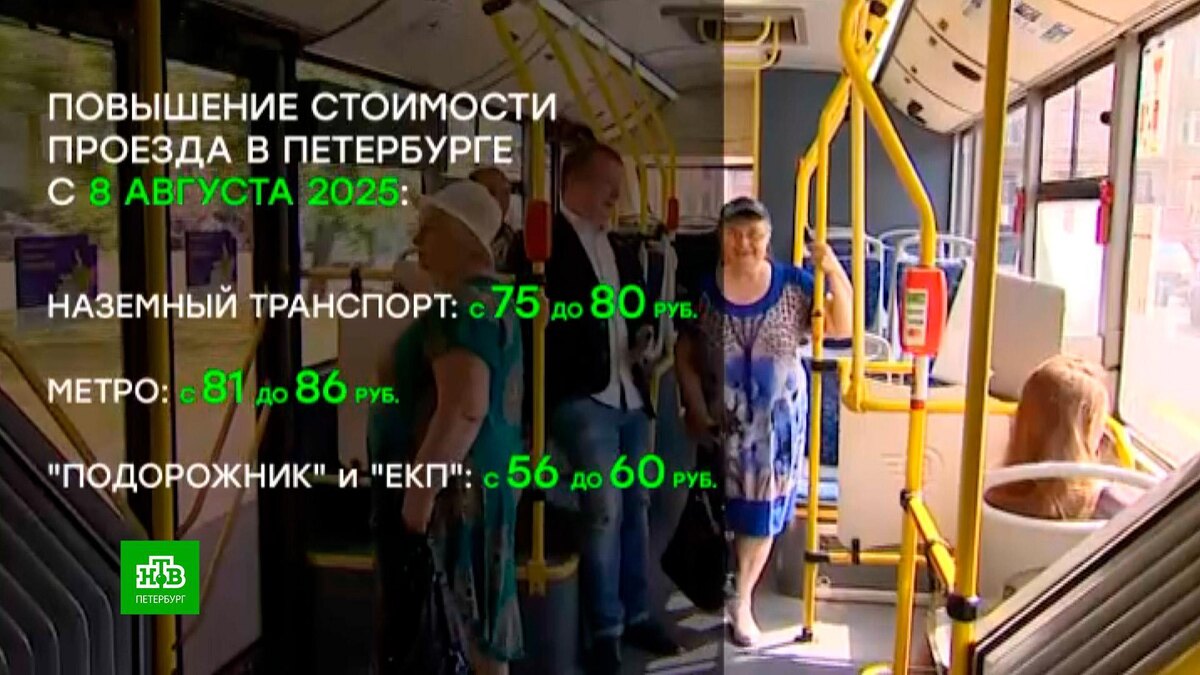 [ Смотреть видео на сайте НТВ ] Стоимость проезда в общественном транспорте возрастет. О повышении тарифов заявили сегодня в Смольном. С 8 августа цена увеличится в среднем на 6,5%. Поездка в наземном транспорте обойдется в 80 рублей, жетон на метро прибавит с 81 до 86 рублей. По «Подорожнику» или «Единой карте петербуржца» можно будет проехать за 60. Единый именной льготный билет на месяц пока останется без изменений — 797 рублей. Это уже второе повышение цен за последние семь месяцев в Петербурге. В целом, по году тарифы возрастут более чем на 22%. Еще в декабре 2024 года поездка по «Подорожнику» обходилась на 11 рублей дешевле. [ Смотреть видео на сайте НТВ ]