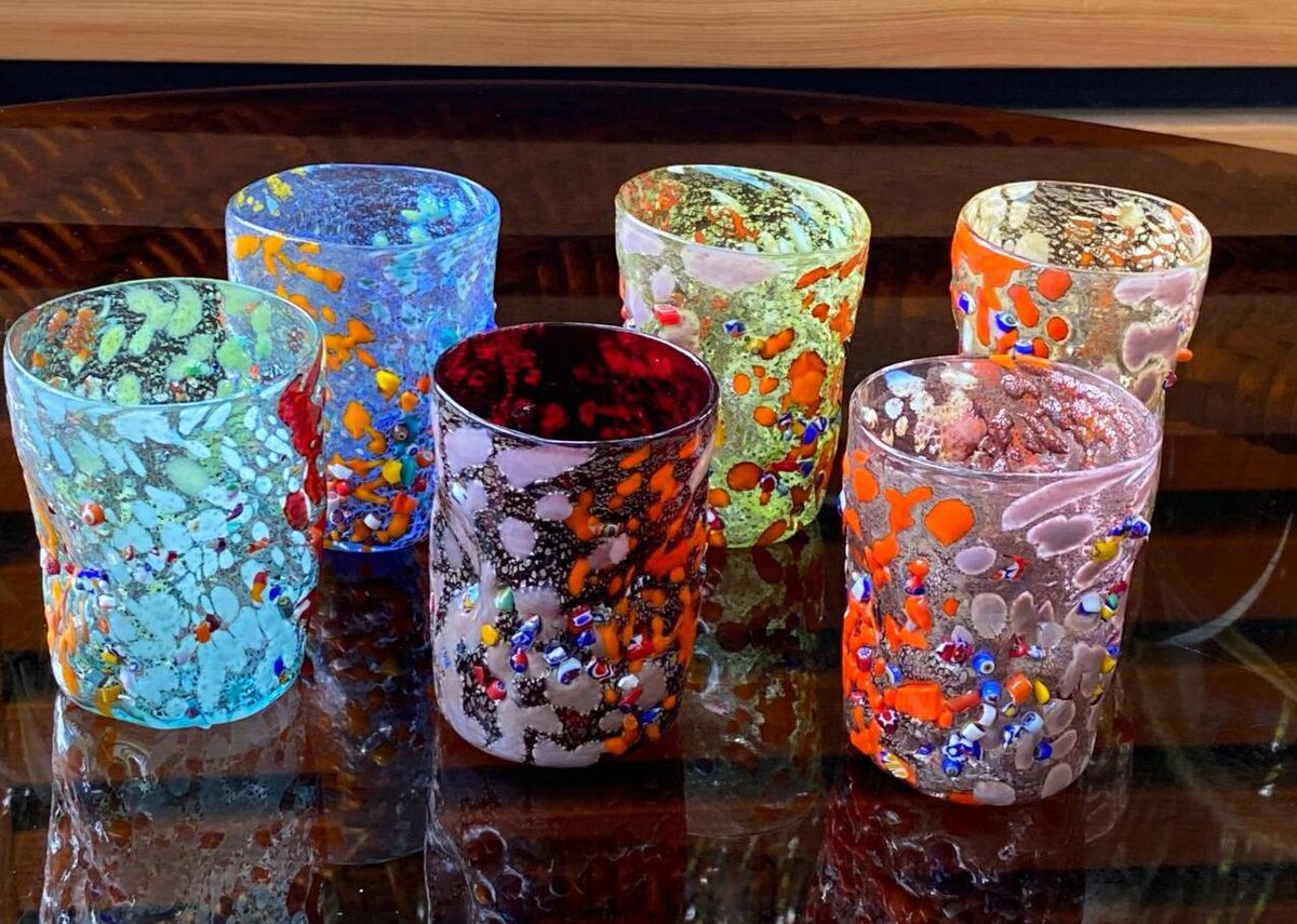 Представляем эксклюзивный набор из шести стаканчиков, выполненных в технике филигранного муранского стекла с характерными мурринами