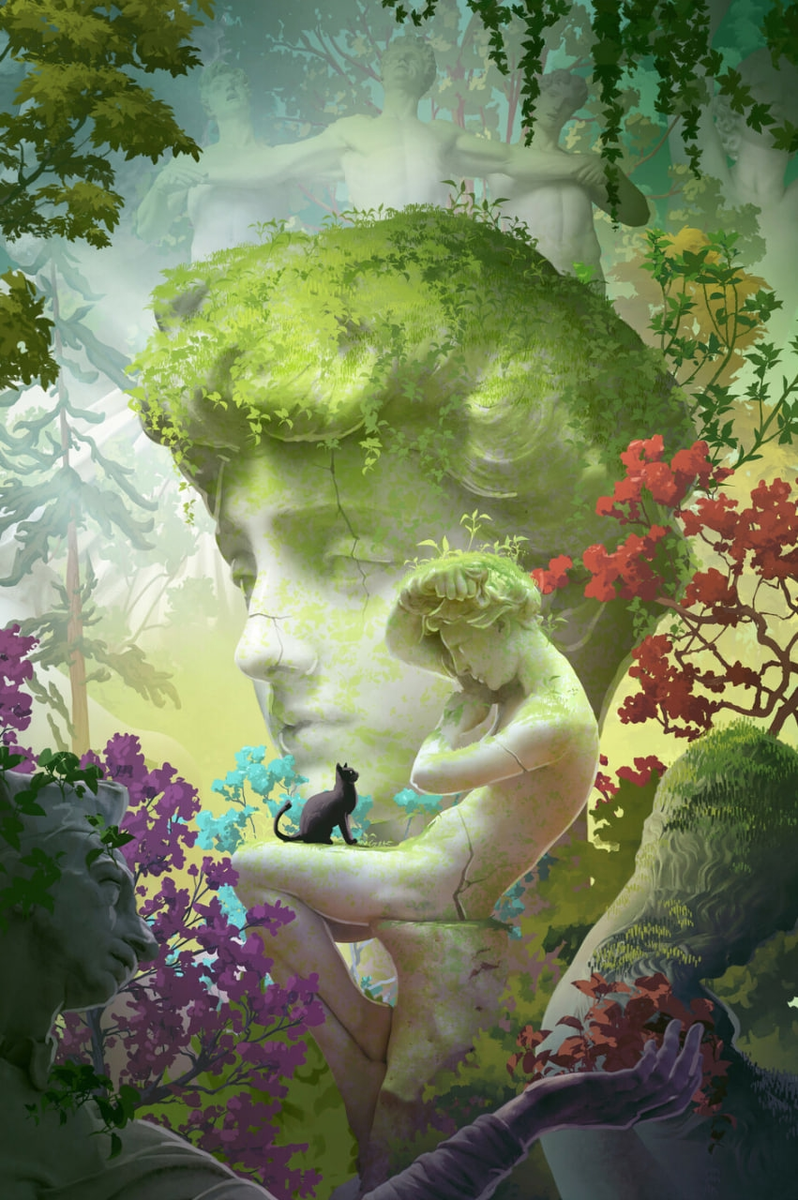На картине изображены скульптурные формы, которые постепенно сливаются с природой. Лица и тела, выполненные в стиле классической античности, покрыты зеленью, цветами и растительностью, что создаёт гармонию между искусством и природой. Цветочные элементы и растения на поверхности скульптур символизируют единение природы и человеческого творчества. Атмосфера мягко освещена, а цвета плавно переходят от зелёных и жёлтых оттенков к ярким акцентам на цветах и листьях. Этот переход подчеркивает идею бесконечности и цикличности жизни.