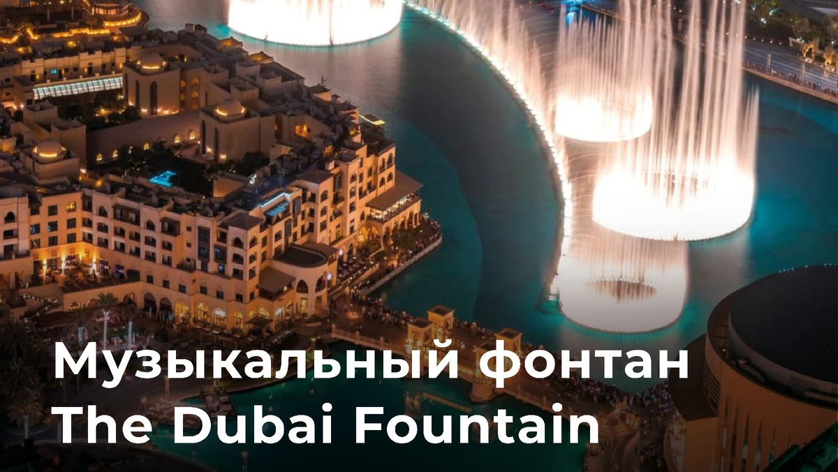 ➊ Расположен в искусственном озере площадью 12 га у подножия Burj Khalifa в Downtown Dubai и представляет собой незабываемое зрелище. ➋ О строительстве фонтана застройщик Emaar объявил в июне 2008. ➌ Проект принадлежит калифорнийской компании WET Design, создавшей музыкальный фонтан перед отелем Bellagio в Лас-Вегасе. ➍ Стоимость строительства $218 млн. Название было выбрано по итогам конкурса. ➎ Открытие состоялось 8 мая 2009 совместно с церемонией открытия ТЦ Dubai Mall. ➏ Длина фонтана – 275 м, что больше 2 футбольных полей. Он состоит из 5 кругов разного диаметра и двух арок. ➐ Внутри установлены «водяные роботы» – шутеры, которые под давлением выталкивают воду. Подвижные форсунки создают эффект «танца воды». ➑ Высота струй – 150 м, что равно высоте 50-этажного здания. Когда фонтан работает, в воздухе каждую секунду находится до 83 тонн воды. ➒ Имеет 6600 точечных ламп и 25 цветных проекторов, которые создают более 1000 оттенков воды. Лучи света от фонтана можно увидеть в радиусе 3