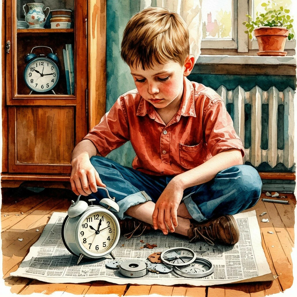 Открутил заднюю крышечку... Ах! Там было целое сокровище! Крошечные, блестящие, как новые монетки, шестерёнки. Тоненькая пружинка, похожая на серебряную ниточку. И сам виновник торжества — красный молоточек на своей изящной дужке. Пахло маслом и... тайной!