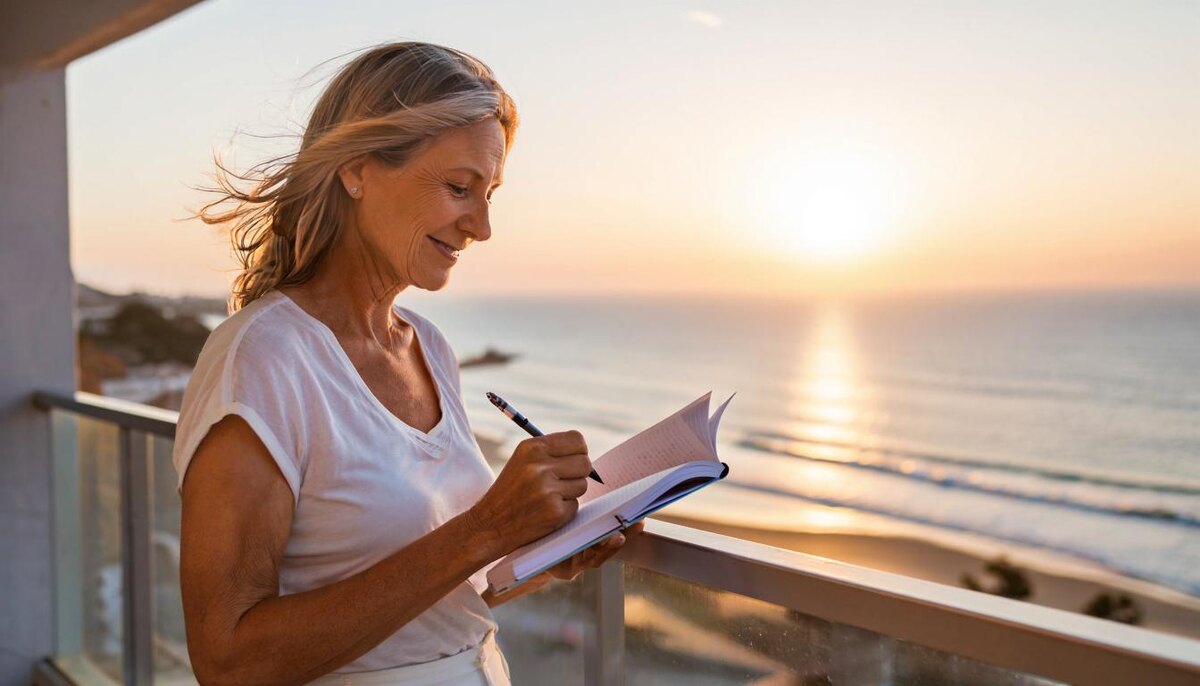 Галина стоит на балконе съёмной квартиры у моря. Первые лучи солнца окрашивают волны в золотой цвет.
