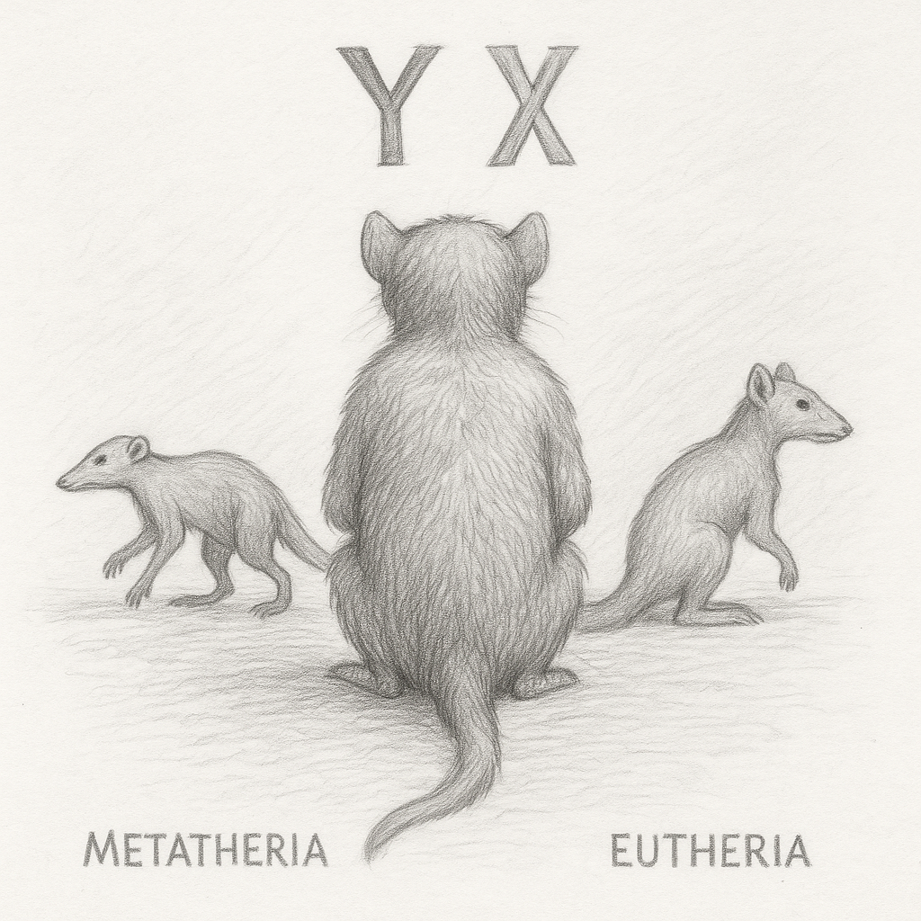 Около 180 млн лет назад у зверька‑предка всех сумчатых и плацентарных, названного Theria, в клетке случилось судьбоносное событие: одна пара обычных аутосомных хромосом распалась, и одна из «осмелевших» сестёр‑хромосом обрела ген SRY — будущий переключатель мужского пола. Так на свет появилась первая Y-хромосома — скромная, крупнее современной человеческой, ещё полная рабочих генов и вполне равная по размерам и функциям своей бывшей половинке X.