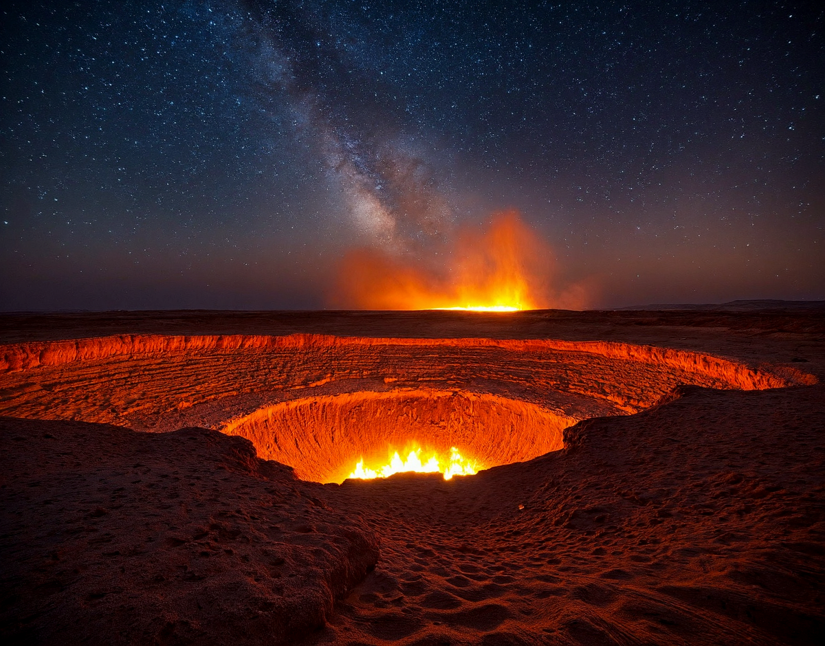 Настоящая. Местные называют её «Врата Ада», хотя официально это Дарвазинский газовый кратер — техногенное чудо, родившееся из ошибки. 1971 год. Советские геологи бурили в поисках природного газа.