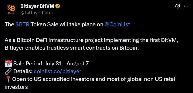С 31 июля стартует продажа токенов Bitlayer — второго уровня блокчейна для BTC, основанного на уникальной виртуальной машине BitVM.