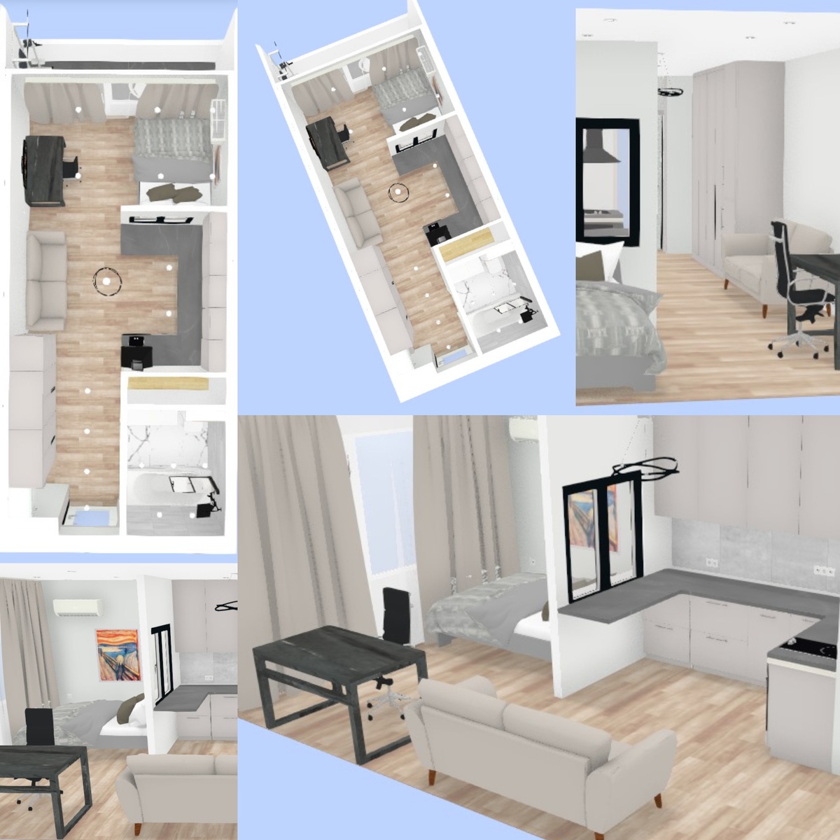 Перед нами стояла амбициозная задача — создать дизайн-проект для компактной студии площадью 27 м², учитывая все пожелания молодой семьи. Мы стремились сделать каждый квадратный метр функциональным и удобным. Пожелания заказчика: Особенности планировки: Решение: Мы предложили клиенту более десятка вариантов планировок. Эта планировка с зонированием спальни стеной создает уютное пространство для сна и отдыха. Светлое окно добавляет комнате естественности и тепла. Основные элементы: Преимущества планировки: Недостатки: * Сложное восприятие пространства.