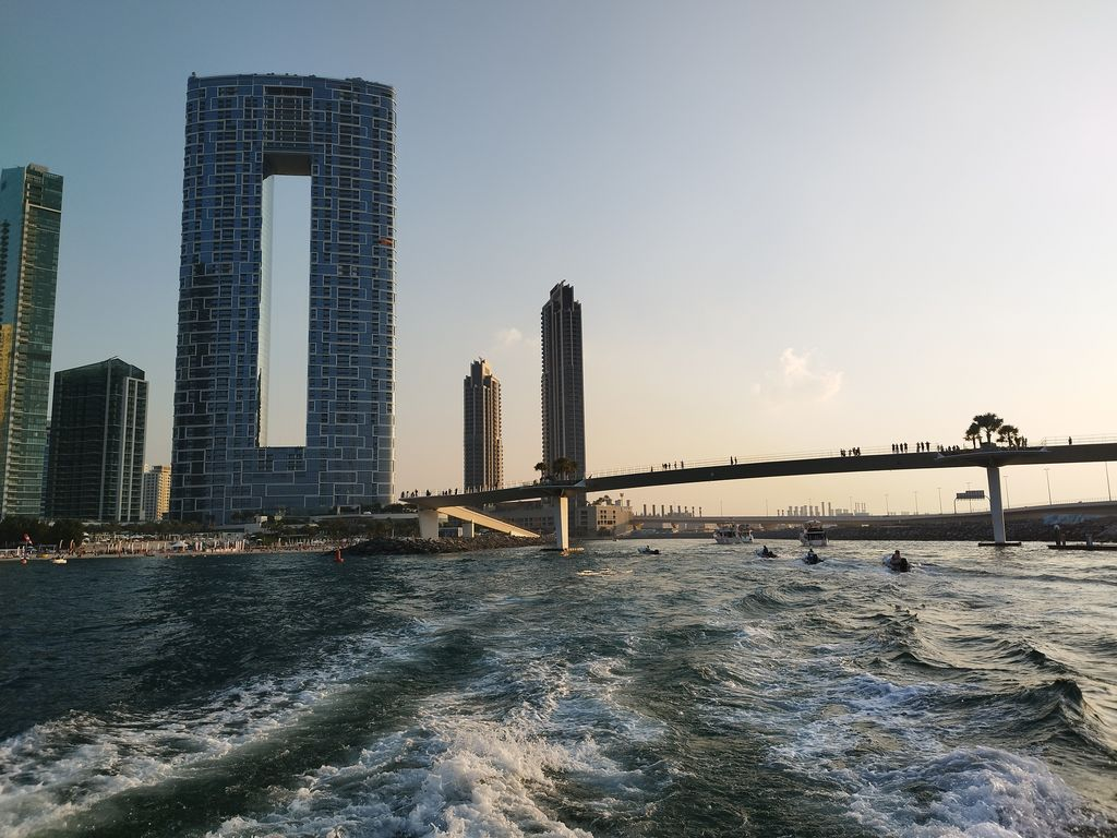 Но все путешествия однажды заканчиваются и хочется взглянуть на Дубай со стороны Прогулочные корабли отходят от пристани в Jumeira Beach Resort На волнах покачиваются частные катера и яхты Но вот наконец наш корабль выходит на простор моря. Дубай напоследок удивляет нас своей архитектурой. И кто-то летит на параплане на фоне вечернего неба Сильное впечатление Думаю, информация о 20% всех высотных кранов мира, работавших в Дубае, это правда Отель Atlantis The Palm, построенный на искусственном острове. Забавно, точно такой же я видел на Багамах, в Нассау. Солнце заходит и скоро закончится наше путешествие Ну что же. Сюда было любопытно приехать. Но жить здесь постоянно... Здесь интересно и странно. Часть первая - Дубай. Город Часть вторая - Дубай. Бурдж-Халифа и Дубай молл Часть третья - Дубай. Золотой рынок Часть четвёртая - Дубай. Jumeira beach resort Часть пятая - Дубай. Sufouh beach Часть шестая - Дубай на горизонте, мой капитан! Оригинал - https://justfedja.livejournal.com/23720.ht