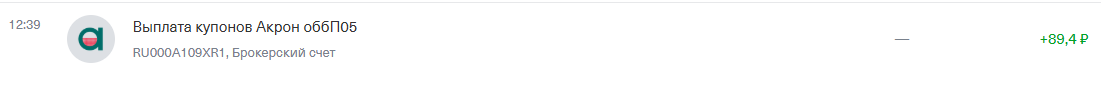 Сегодня поступление было по бумагам "Акрон оббП05" в размере 89,4 рублей за 5 штук.