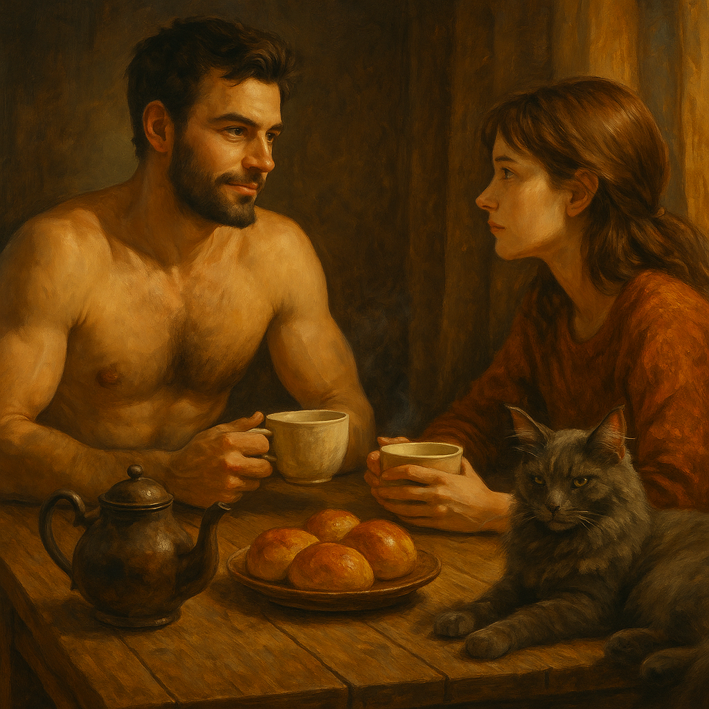 Не думаю, что сотрясение задницы дает столь сильный эффект на голову. Но как объяснить, что в кухне обнаружился какой-то голый мужик? Он стоял у печки, оперевшись одной рукой о стол, и, не смущаясь, пялился на горящий газ. Рядом в железной раковине тихо наполнялся чайник водой из-под крана.