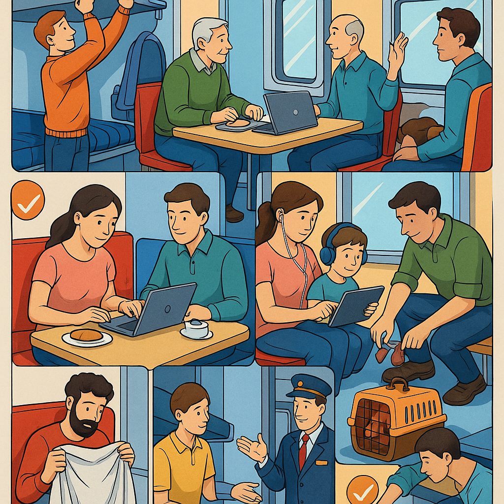 ➡️ Столик — не ваш персональный коворкинг. В эпоху удалёнки поезд часто превращается в офис на колёсах, и это нормально. Но не превращайте общий стол в филиал своего рабочего места, завалив его ноутбуком, документами и проводами.