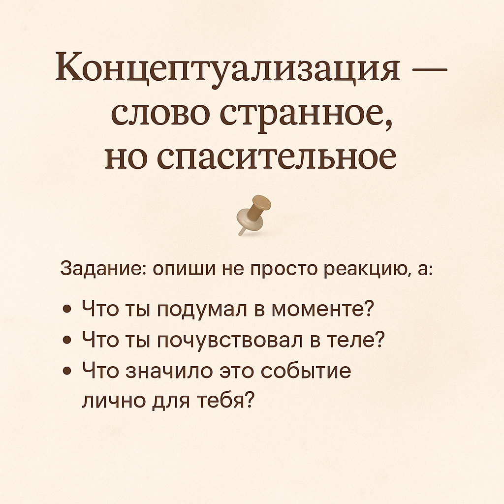 Это не психология. Это не эзотерика. Это не “разбор полётов”. Это — умение видеть, как ты устроен. Когда я концептуализирую клиента — я собираю его внутреннюю карту. 🧷 Где он реагирует на укол. 🧷 Где убегает, как только чувствует давление. 🧷 Где бессознательно доказывает свою нужность. 🧷 Где верит, что его не любят — и живёт оттуда. И вот тогда человек перестаёт быть просто “эмоциональным”. Просто “вспыльчивым”. Просто “неуверенным”. Он становится структурно осознанным. Он начинает понимать, что с ним происходит. И где в этом точка выбора. Представь, что ты — это не хаос реакций. А система. Понятная. Твоя. И в ней всё логично: даже боль. даже злость. даже «зачем я так сделал?!» 📌 Маленькое задание: вспомни ситуацию, в которой ты среагировал остро. И вместо «опять сорвался», напиши: — Что ты подумал в моменте? — Что ты почувствовал в теле? — Что значило для тебя это событие? Ответы — и есть твоя карта. Которая ждала, чтобы её увидели.