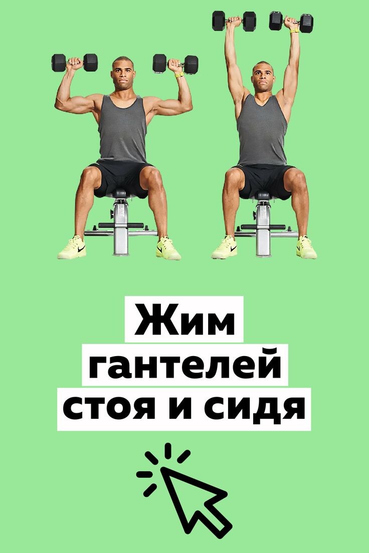 * **Жим гантелей сидя/стоя:** Базовое, тяжелое движение. Сядьте на скамью с вертикальной спинкой (или стойте), гантели на уровне плеч ладонями вперед. Выжмите гантели вверх по дуге, сводя их вверху почти вместе (но не сталкивая). Медленно опустите. *Вариант: жим нейтральным хватом (ладони друг к другу).*