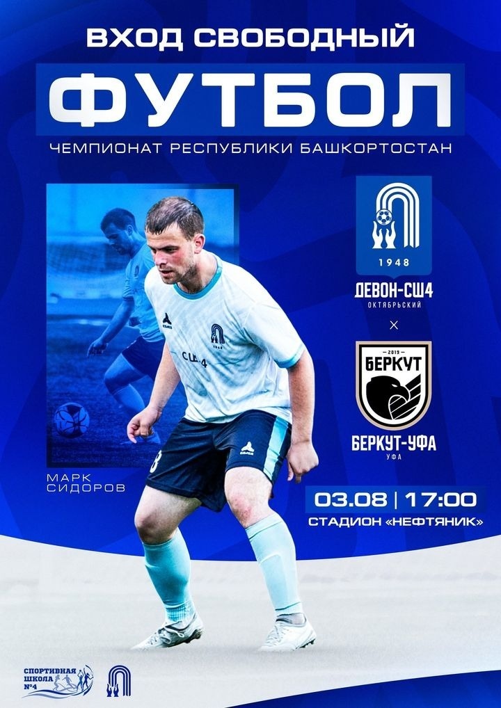 На стадионе «Нефтяник» состоится матч чемпионата Башкирии по футболу среди мужских команд. На поле встретятся «Девон-СШ № 4» из Октябрьского и футбольный клуб «Беркут-Уфа». Октябрьские футболисты сразятся с уфимскими в мастерстве 3 августа. Начало в 17.00. Вход свободный.