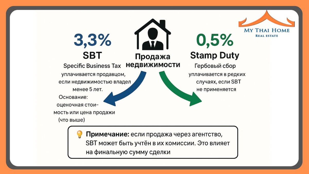 Купил квартиру - заплати налоги. Что, сколько и кто платит при покупке недвижимости в Таиланде в 2025 году. Казалось бы, нашёл квартиру, подписал договор и живи под пальмами. Но не всё так просто. На этапе покупки могут всплыть налоги и сборы, о которых не всегда говорят сразу. Чтобы потом не было сюрпризов - лучше знать заранее, что и сколько платить. Это основной обязательный налог при смене собственника. Он составляет 2% от кадастровой стоимости объекта недвижимости. Эту стоимость оценивает земельный департамент Таиланда, и она обычно ниже рыночной. Кто платит: по закону - покупатель, но часто стороны делят этот сбор пополам. Этот налог в размере 3,3% от оценочной стоимости или цены продажи (в зависимости от того, что выше) платится, если продавец владел недвижимостью менее 5 лет. Кто платит: продавец. Но важно знать — если объект продавался через агентство, комиссия может включать этот налог, что влияет на итоговую сумму сделки. Если продавец освобождён от SBT (например, владел нед