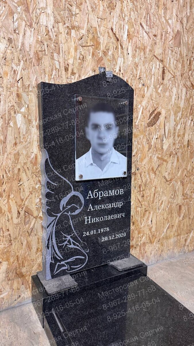 Модель В 138, выполненная из благородного чёрного гранита Габбро-Диабаз, — это образец классической строгости и душевной глубины. Верх памятника изогнут в форме волны — как символ перехода, спокойствия и вечности. Слева выгравирован ангел с руками, сложенными у груди — в позе тихой молитвы и прощания. Чёрно-белая композиция подчёркивает глубину чувств, а каждая линия, каждая деталь несёт в себе уважение к ушедшему. Портрет выполнен на прозрачном стекле, закреплён нержавеющими болтами с покрытием “серебро”.
