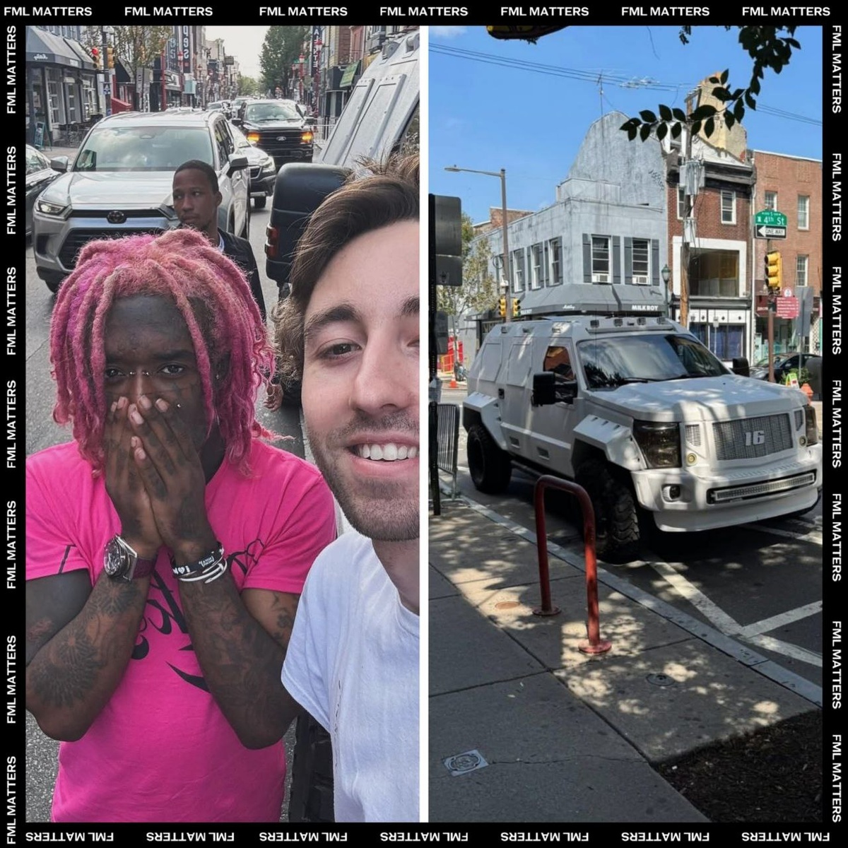 ☄️ LIL UZI VERT И ЕГО БРОНЕВИК! Рэпер был замечен, разъезжающим по улицам родной Филадельфии на внушительном бронированном джипе. Цифра 16 на решётке радиатора — это отсылка к его району «1600» в северной Филадельфии. Это часть квартала Francisville, где он вырос. 💀 FML MATTERS