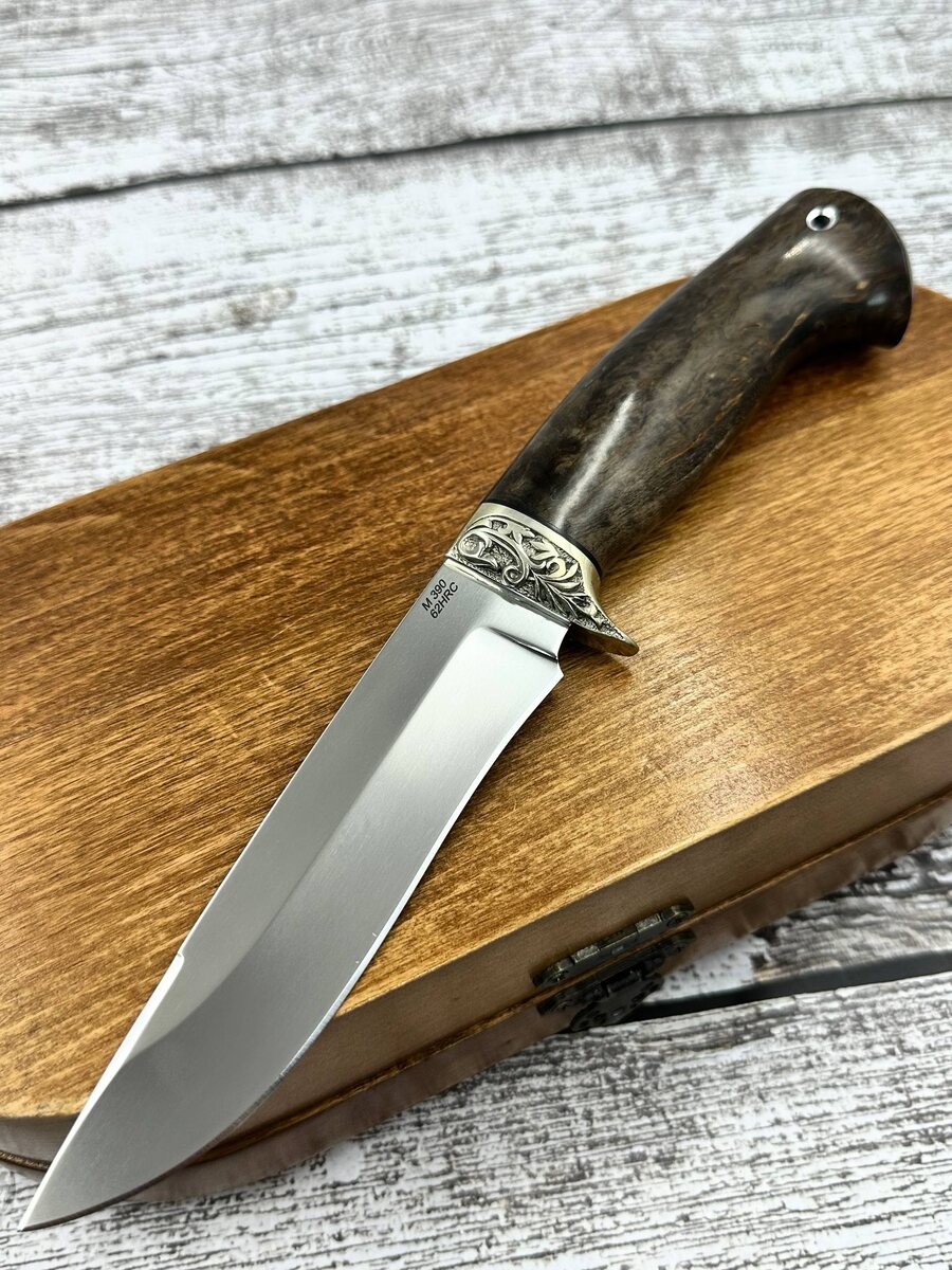 В наличии нож ручной работы из премиальной стали M390 — этот материал отличается идеальной стойкостью к коррозии, долго держит заточку и не боится серьёзных нагрузок. *Уход минимальный, результат — максимум!*
