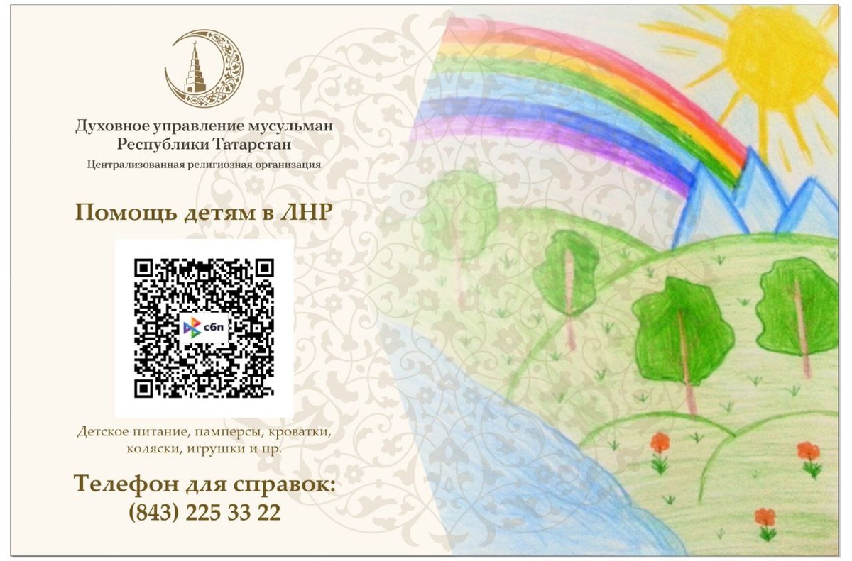 ❗️❗️❗️Внимание! Сбор средств в поддержку детей из Лисичанска и Рубежного ЛНР 🤝 📌Помощь 🎁🛍 требуется 210 детям 📌Средства будут направлены на детское питание, детские средства гигиены 🧴🧽 , детскую одежду и мебель 🛏 и пр. 📌Список предметов необходимости сформирован исходя из пожеланий родителей ❗️❗️❗️ Гуманитарный груз отправится в ЛНР в середине августа 📌Сбор средств осуществляет Благотворительный фонд «Закят» ДУМ РТ 🤲🤲Внести свой вклад в поддержку может каждый желающий, пройдя 👉по указанному куар-коду.