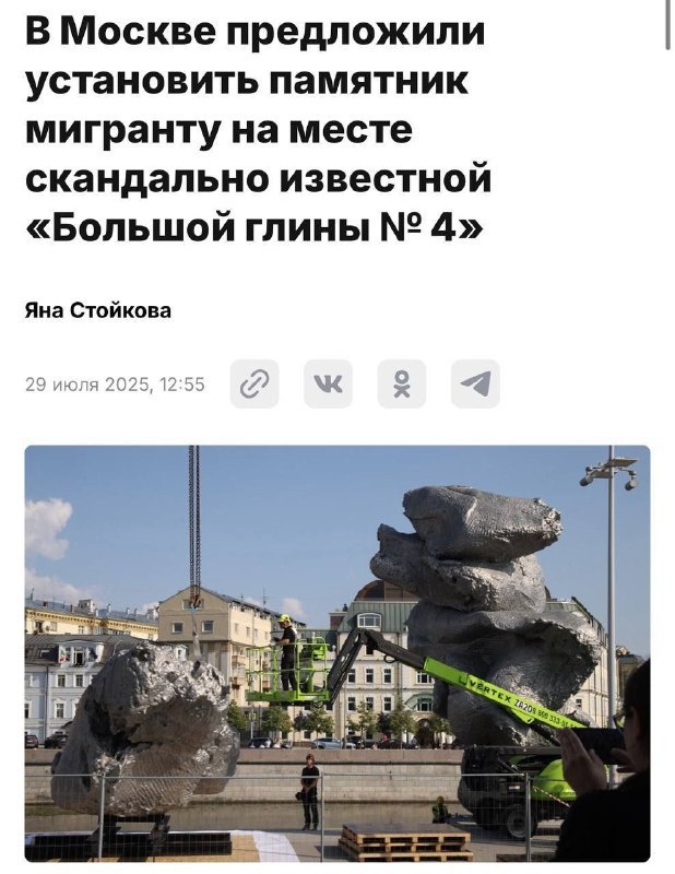 Болотная набережная в Москве не должна пустовать после прощания с легендарной «Большой глиной №4» — той самой алюминиевой кучей, что четыре года вдохновляла горожан на бурные дискуссии о высоком искусстве. На ее месте глава Профсоюза трудящихся мигрантов Ренат Каримов предлагает воздвигнуть памятник трудовым мигрантам. Тем, кто по его словам «экономит России триллионы рублей», укрепляет дружбу народов и добавляет красок в нашу многонациональную палитру. На инициативу отреагировала глава Лиги безопасного интернета Екатерина Мизулина. «Такие предложения — это шутка? Плевок в сторону российского общества? Вызов? Или что?», - написала Мизулина в своем ТГ-канале. Кажется, эти вопросы возникли у всех, кто накануне видел эту «прекрасную» новость.
