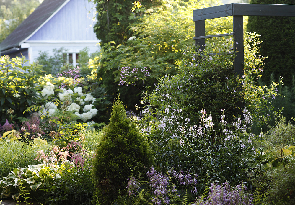 В саду за домом цветут физостегия, гортензии, хосты, астильбы. Вечером большинство растений прекрасно смотрятся напросвет. Да в целом тоже неплохо. Вот физостегию со шмелем поймала. Еще парочка видов. А в палисаднике так. В розовом цветнике на первых ролях не розы, а клематисы. Голубой - Арабелла. Цветки из темно-лиловых при роспуске становятся лилово-голубыми. На решетке там еще один клематис, не знаю названия. А в целом как-то так. А Помпонелла цветет слабовато. С ней вероникаструм. И напоследок валерина липолистная около ручья. Завтра покажу утро!