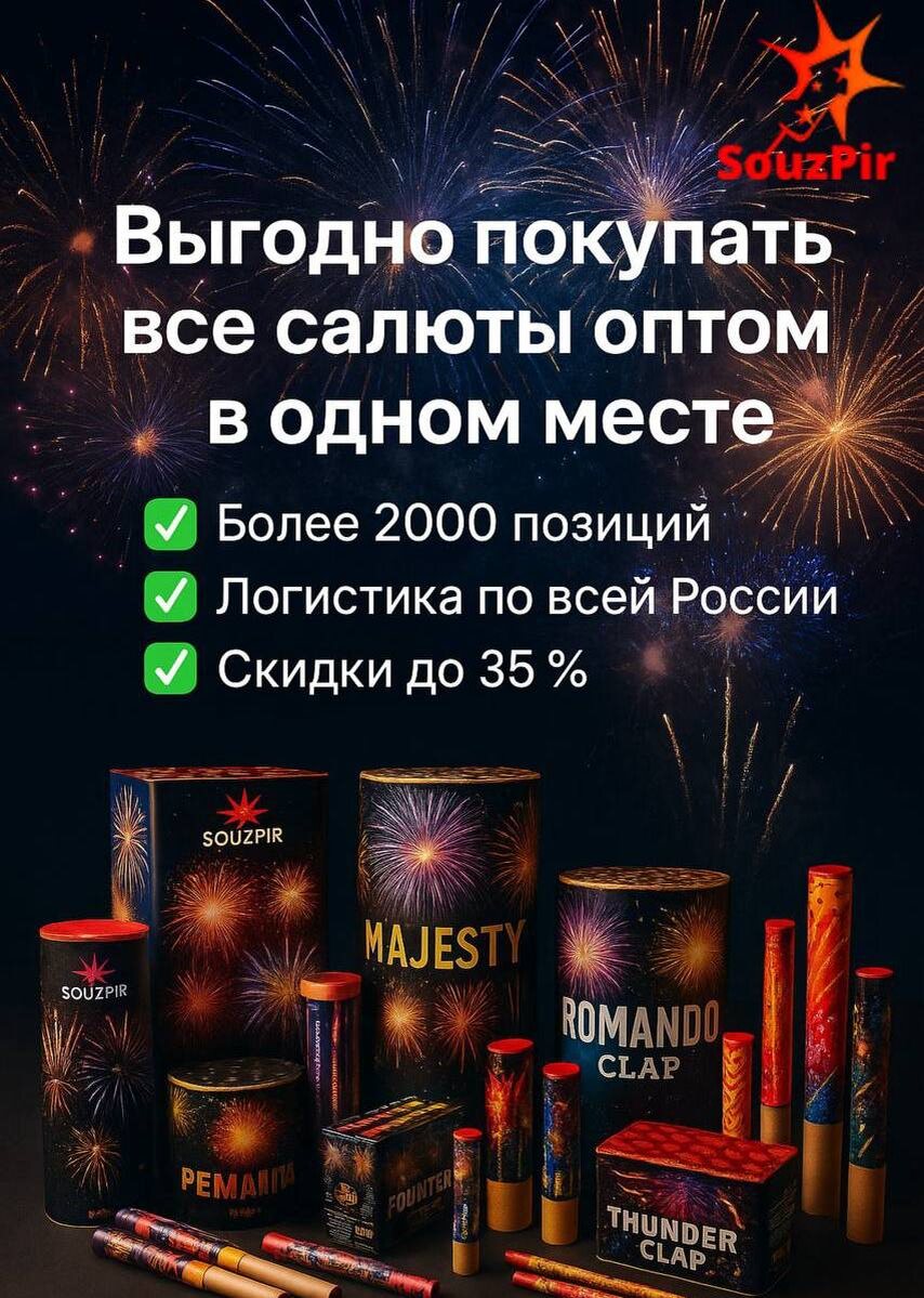💡 Вы знали, что при работе с разными поставщиками можно потерять до 35% бюджета? Разные цены, дублирующаяся логистика, задержки по срокам — всё это бьет по вашему делу. Решение простое — работать с одним надежным партнером. Souzpir (Союз Пир) — федеральный поставщик оптовой пиротехники с опытом более 20 лет. Мы знаем, как сделать так, чтобы ваш салют всегда состоялся! Более 2000 позиций пиротехники на складе: салютные батареи, римские свечи, фонтаны, петарды и спецэффекты. Вам не придется искать по разным магазинам. Доставка по России за 2–10 дней. Единая логистика = никаких срывов сроков. Souzpir гарантирует качество: продукция соответствует ТР ЕАЭС 017/2011, документы всегда под рукой онлайн. К каждому заказу прикладываем сертификаты. Оптовые скидки, персональные цены и отсутствие двойных перевозок. Каждый заказ — это реальные деньги, которые вы не тратите впустую. Мы подберем салюты под ваш бюджет. Это сервис уровня «всё под ключ». Обмен и возврат без лишней бюрократии, Ваш праздни