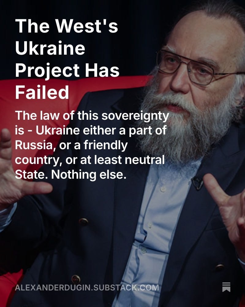 The West's Ukraine Project Has Failed The law of this sovereignty is - Ukraine either a part of Russia, or a friendly country, or at least neutral State. Nothing else. Read the full article here: https://alexanderdugin.substack.com/p/the-wests-ukraine-project-has-failed