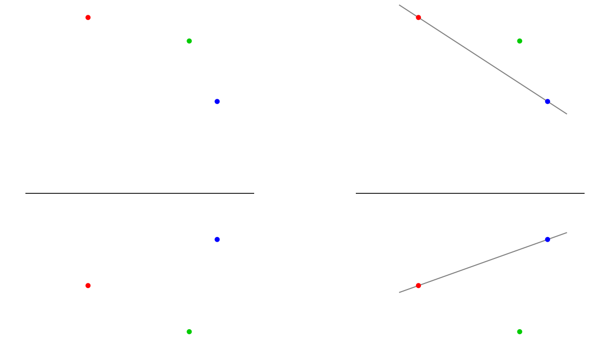 Если у нас имеются проекции четырех точек, принадлежащих плоскости, мы можем получить проекции двух прямых, которые будут определять плоскость. Эти прямые могут быть как пересекающимися (слева на рисунке), так и параллельными (справа на рисунке). На обеих частях рисунка изображена одна и та же плоскость.