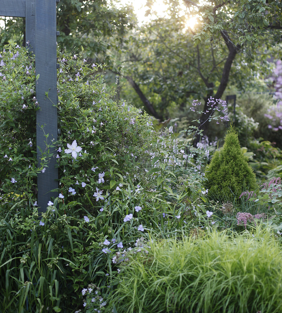 Если вечером краски яркие и насыщенные, наполненные солнцем, то утром все словно покрыто легкой белой дымкой, припудрено росой. Поэтому фото совсем другие, чем вечером, нежные и мягкие. На первом фото василисник, но какой конкретно, рохебруннский или Делавея, не знаю. Растут оба. Лилии на этом фото - случайно затесавшиеся, но ничего тут смотрятся. А эти сажала специально. Еще виды. Голубой клематис на перголе каждый год клянусь пересадить, он дает несколько цветков, не нравится ему тут. Но фотогеничный. Еще фото с этого ракурса. Зеленый домик утром тоже прекрасен. Сбоку обелиск. Вот, пожалуй, и все на сегодня.