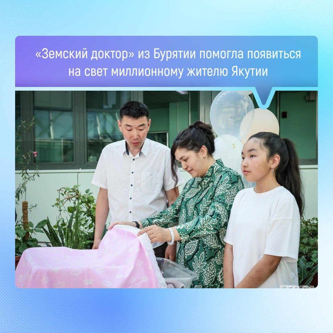 Врач-гинеколог Мария Будаева из города Мирный после окончания интернатуры в 2019 году три года проработала в акушерском стационаре Перинатального центра г. Улан-Удэ. В алмазном крае оказалась совершенно случайно, приехав в 2022 году погостить к подруге. Мирный ей понравился, и она решила остаться. Устроилась на работу в Мирнинскую ЦРБ, заключила контракт и приняла участие в программе «Земский доктор». Именно она помогла появиться на свет миллионному жителю Якутии. «Это было очень неожиданно и очень приятно. Это как лотерею выиграть. Так совпало, что это и мой первый год работы здесь, и женщина эта именно у меня была на учете. Очень радостно, что миллионный житель Якутии – ребенок из города Мирный», – вспоминает Будаева. В Якутии благодаря реализации программы «Земский доктор» и «Земский фельдшер» в отрасль привлечено 1 557 медицинских работников, в том числе 1 290 врачей и 267 фельдшеров. На прошедшем совещании с членами правительства РФ Владимир Путин призвал власти регионов обе
