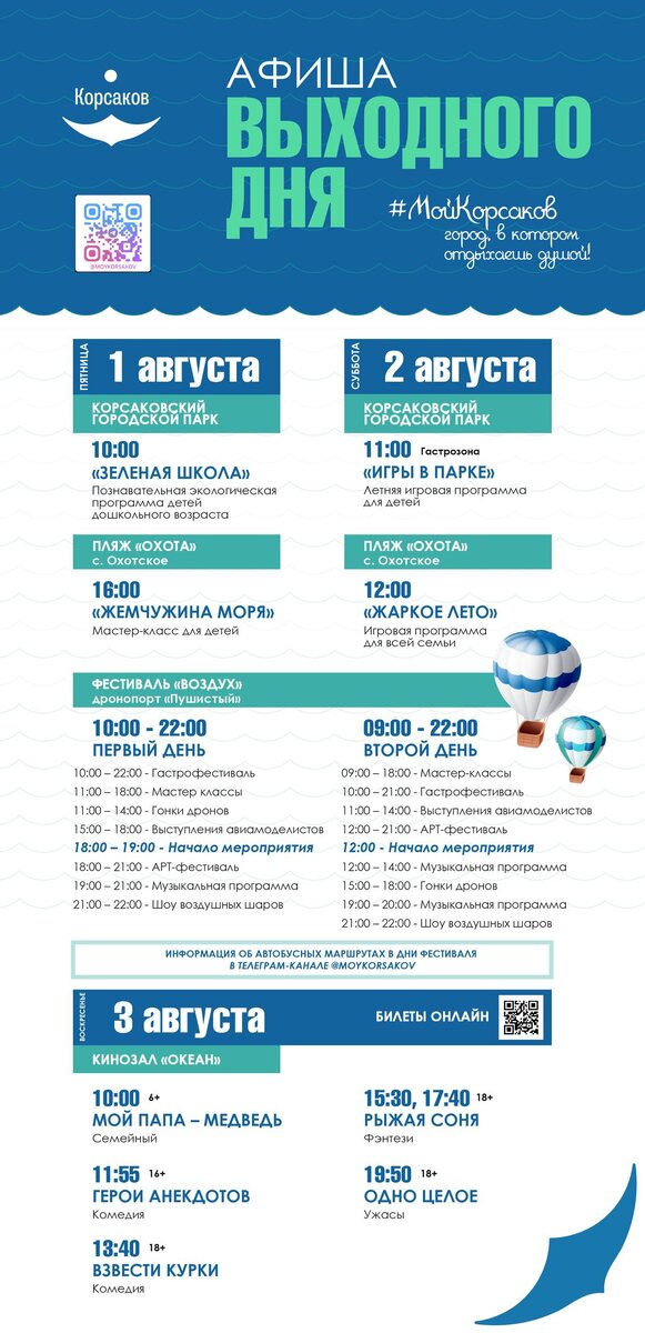 Хотите провести выходные ярко и с пользой? Мы подскажем, куда отправиться! 🌊Лучшее место для тех, кто хочет совместить отдых у воды с развлечениями для всей семьи — это пляж «Охота». 🎈Ценителям технологий, гастрономии и искусства обязательно стоит посетить фестиваль «Воздух» на территории дронопорта «Пушистый». 🌲А для тех, кто хочет весело и с пользой провести время с детьми — ждём вас в городском парке. 🎬Киноманам тоже скучать не придётся. В кинозале «Океан» вас ждут самые разные фильмы: семейные комедии, захватывающие фэнтези и ужасы. 🙂Выбирайте то, что вам по душе!