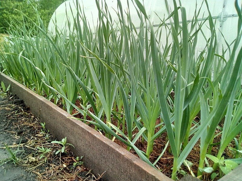 После появления всходов чеснока внесите азотное удобрение: разведите 1 ст. л. мочевины в 10 л ведре воды и полейте раствором каждый квадратный метр грядки.