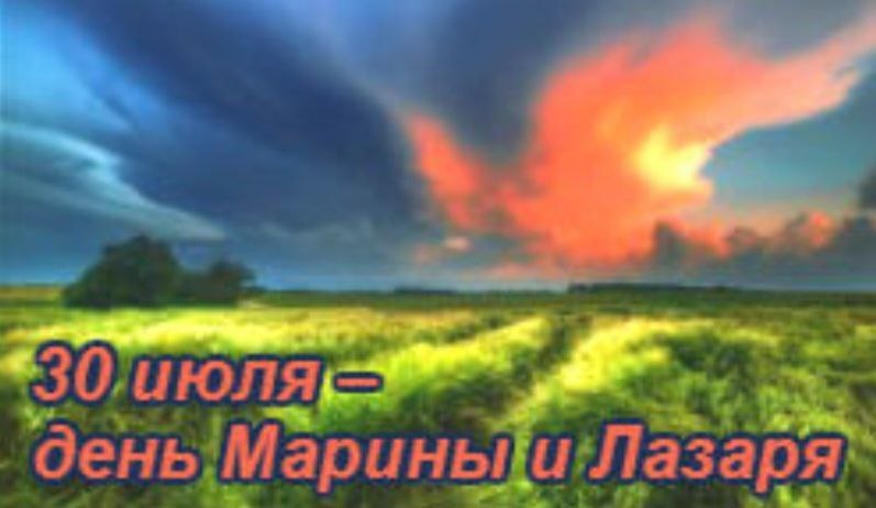 Христиане чтут память святых Лазаря Галисийского и Маргариты Антиохийской. В народе же их прозвали Лазарем и Мариной. Девушку считали сестрой Ильи Пророка. Она ассоциировалась с проливным дождем, а Лазарь - с всполохами молний. Повседневные хлопоты лучше ограничить небольшими домашними делами. Сегодня один из тех дней, когда женщины могут позволить себе отдых. На Марину и Лазаря полагается приготовить блюда из рыбы - это привлечет деньги и удачу. Поэтому приветствуются на столе уха, расстегаи с рыбной начинкой, рыбные котлеты, соленая и вяленая рыба. ÷ Если гроза 30 июля случилась – осень тоже будет дождливой, а зимой будут метели. Жаркий и сухой день 30 июля предвещает малоснежную и холодную зиму. Какая погода в этот день – такой и будет первая половина осени. Чайки на воде сидят – к солнечной погоде.