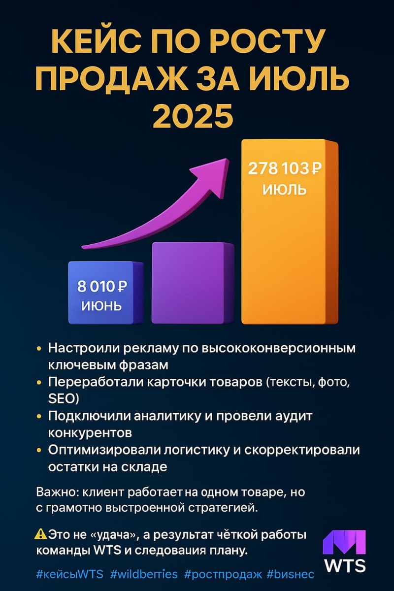 📈 Кейс по росту продаж за июль 2025 Компания WTS продолжает доказывать, что системная работа на маркетплейсах приносит результат. Один из наших клиентов в июне имел всего 8 010 руб. оборота. Спустя месяц — 278 103 руб.. 💡 Что было сделано: — Настроили рекламу по высококонверсионным ключевым фразам — Переработали карточки товаров (тексты, фото, SEO) — Подключили аналитику и провели аудит конкурентов — Оптимизировали логистику и скорректировали остатки на складе 📌 Важно: клиент работает на одном товаре, но с грамотно выстроенной стратегией. ❗️ Это не «удача», а результат чёткой работы команды WTS и следования плану. Если хотите так же — пишите нам, подберём решение под ваш бизнес. #кейсыWTS #wildberries #ростпродаж #маркетплейсы #бизнесонлайн 🔗 @WB_WTS