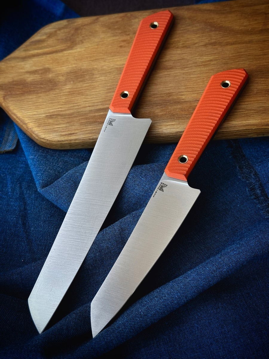 Вот еще новенькие кухонные ножи – "Кирицуки". Есть два размерных варианта: с клинком 125 мм и 180 мм. Обух составляет 2.5 мм. Использовал стал AUS10Co, а на рукояти G10 c насечкой. Кстати, есть и другие варианты расцветок. ‼️Вести диалог только с @burlax1