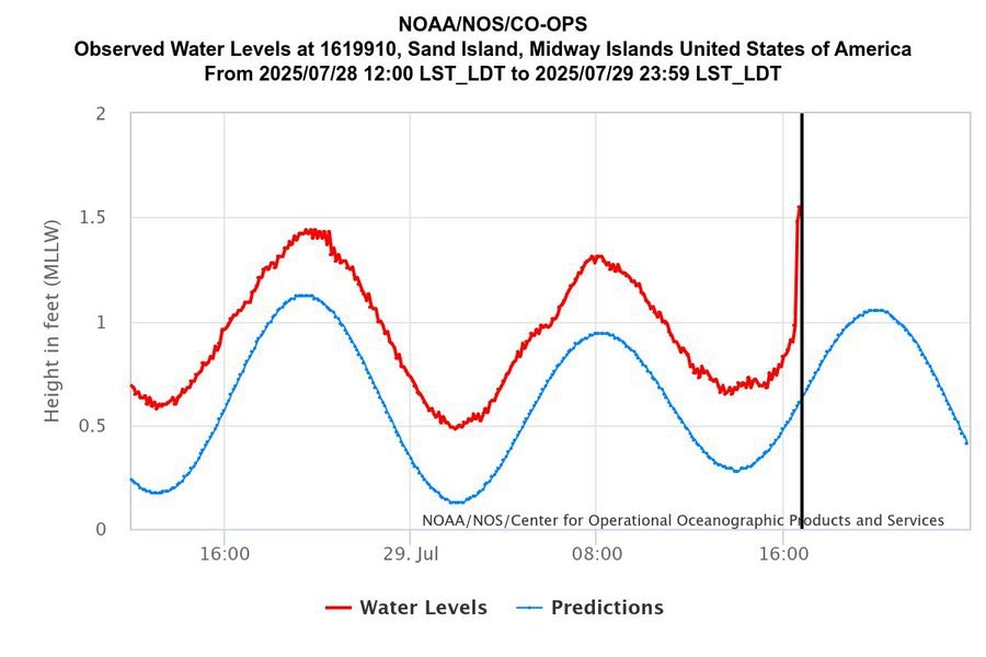 Похоже, мы наблюдаем приближение цунами к островам Мидуэй. Это последняя доступная точка измерения перед Гавайскими островами.