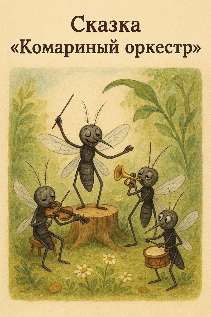Сказка «Комариный оркестр» В далёком лесу, где бабочки танцуют на ветру, а зайцы устраивают чаепития под грибами, жил-был ёжик по имени Шип. У него был уютный домик из мха и коры, и он обожал тишину — особенно на рассвете, когда можно слушать, как капельки росы падают на листья. Но однажды, как только Шип проснулся и потянулся, он услышал отвратительный звук: «Зззззз! Зззззз!» — вокруг его домика кружили комары. Много. Очень много. — О, нет, не снова… — вздохнул ёжик и спрятался под лист. Но комары были настойчивыми. Они жужжали, норовили сесть на нос и даже пытались устроить ночной концерт у него над ухом. Тогда Шип пошёл к старому филину Умнику за советом. — Филин, меня атакуют комары! Они не дают мне спать, думать, мечтать! Умник заулыбался: — А может, они не злы, а просто… слишком музыкальные? Попробуй не бороться с ними, а подружиться. Ёжик сначала подумал, что филин просто шутит. Но на следующее утро он построил крошечную сцену рядом с домом и развесил таблички: «Приглаша
